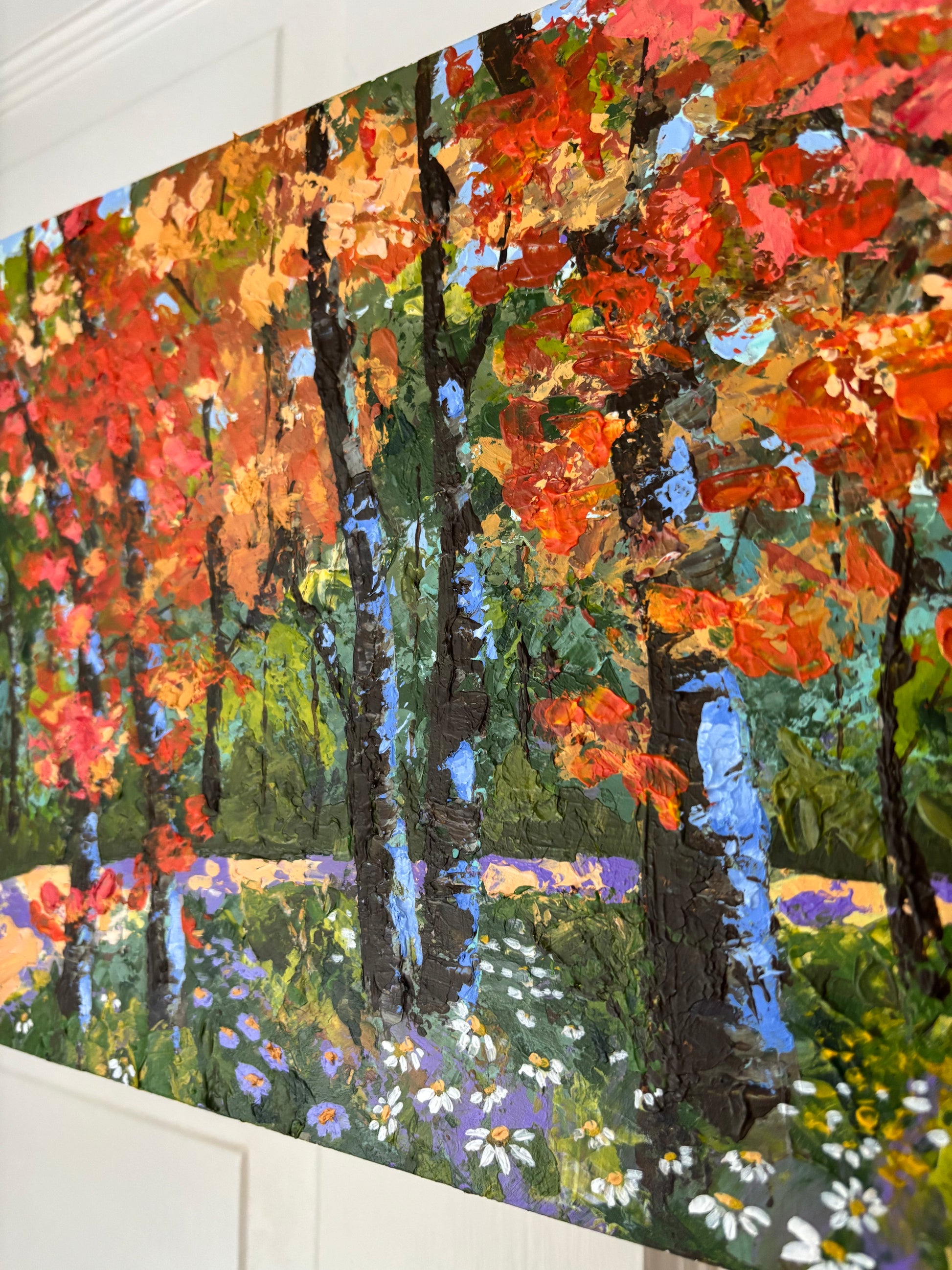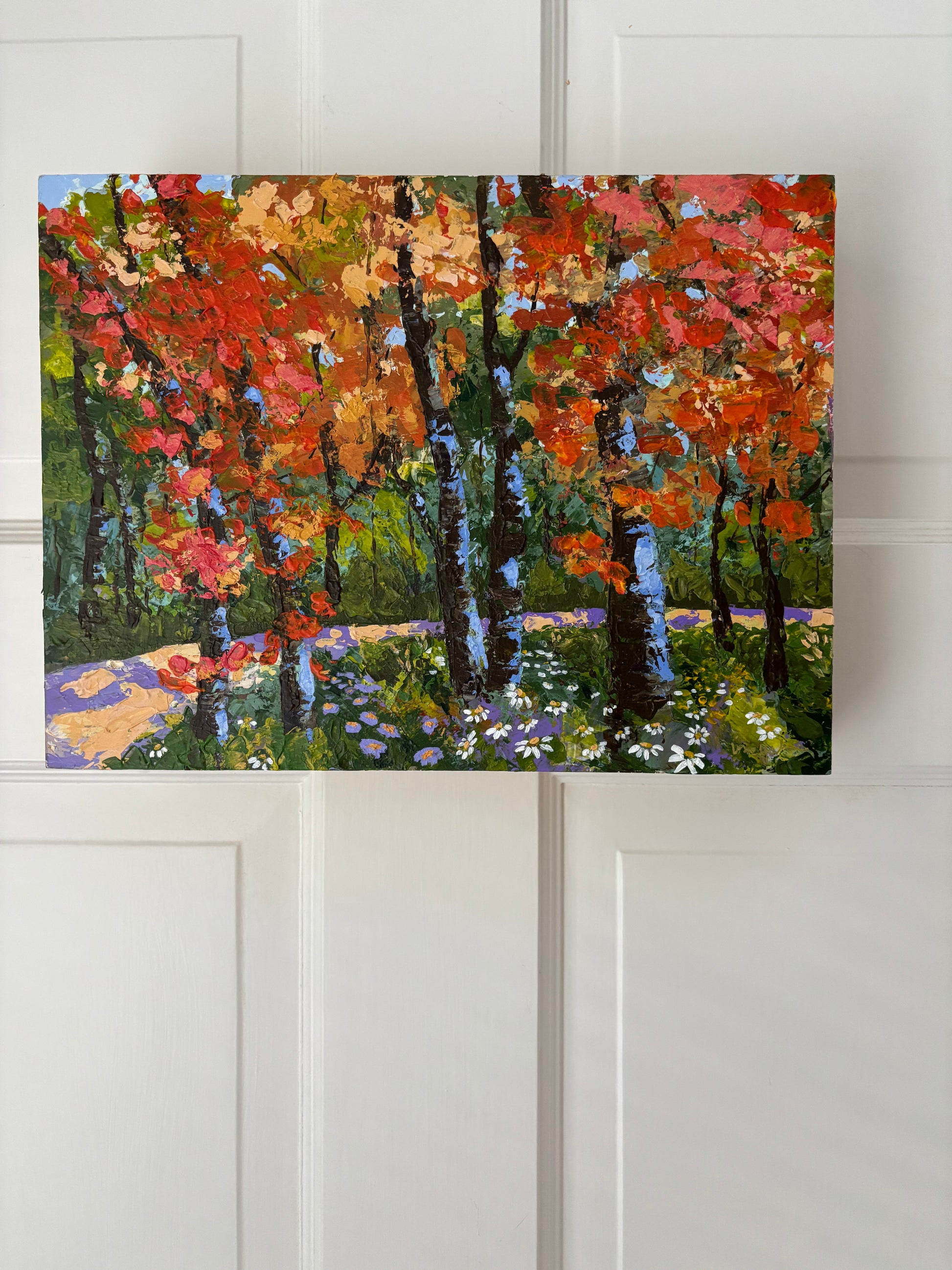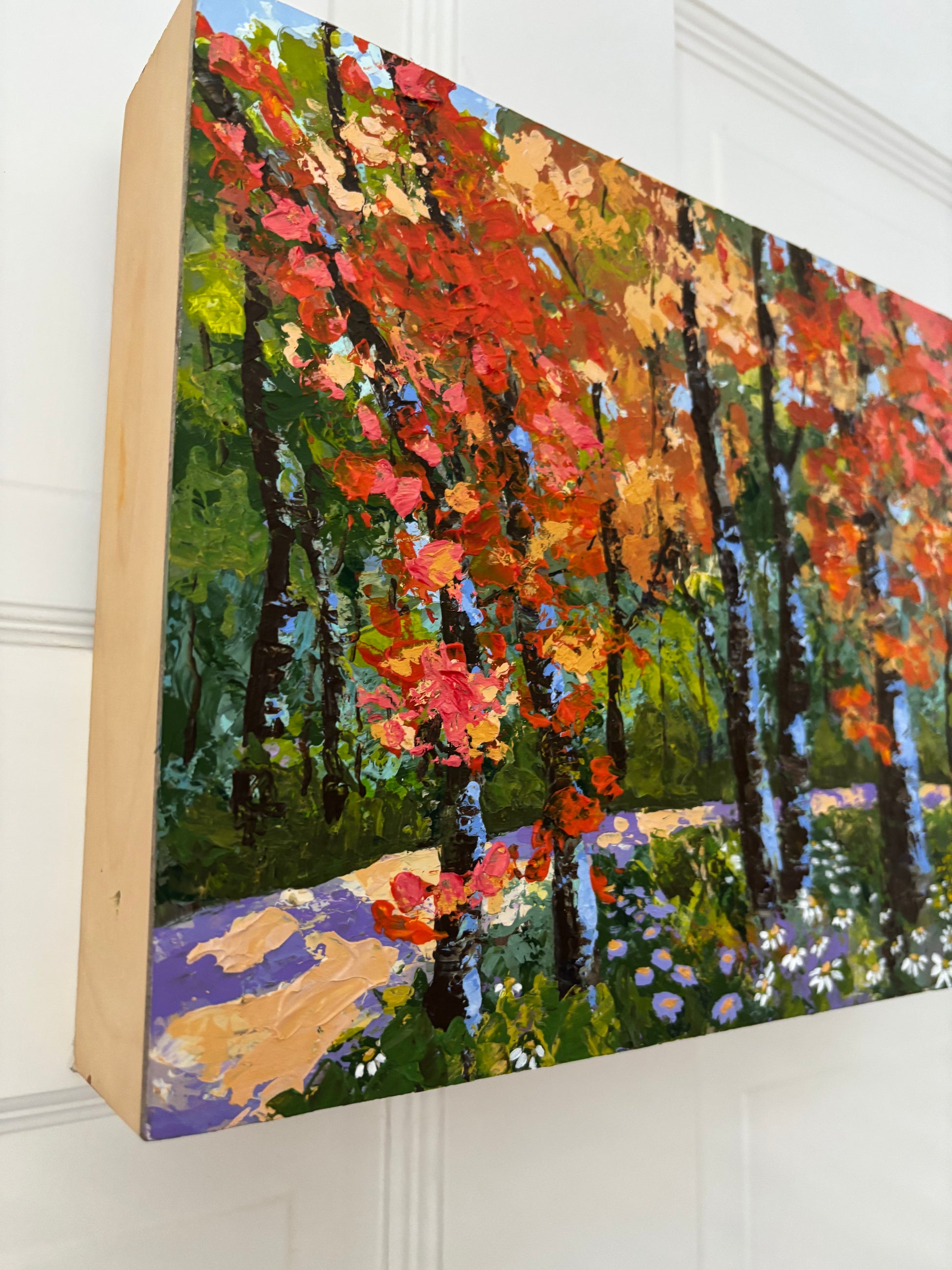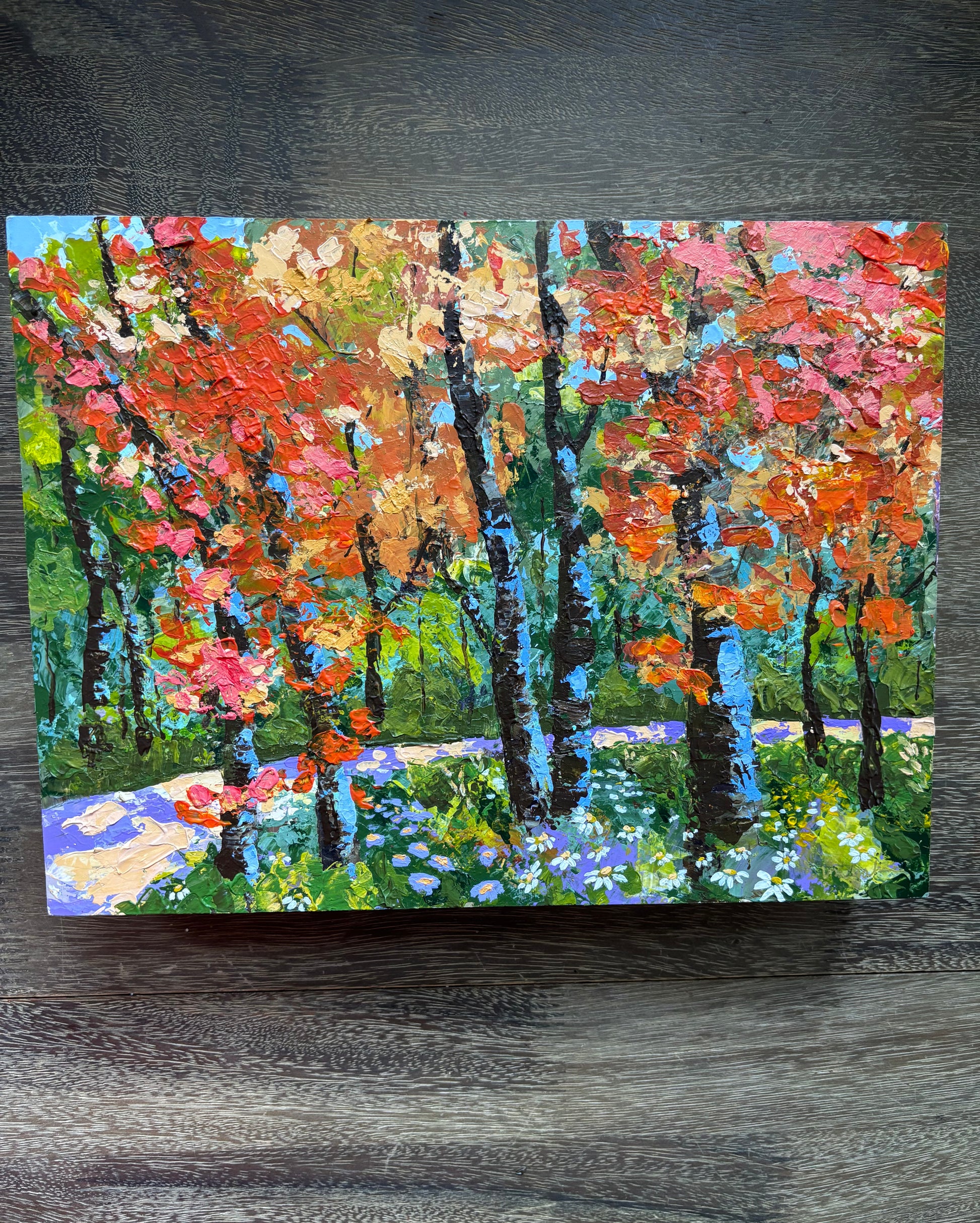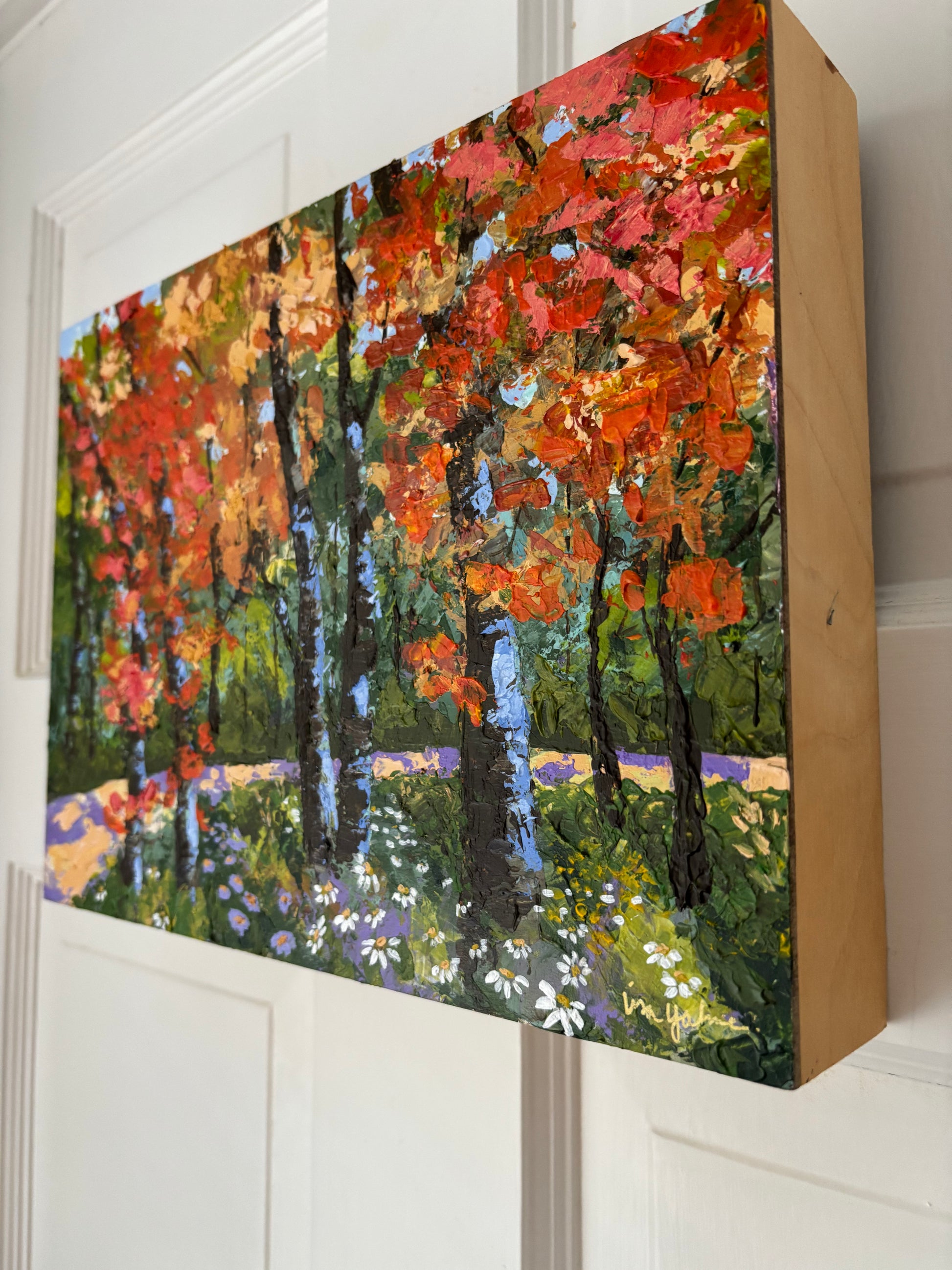 This is an autumn morning painted with acrylics and a pallet knife on cradled board. Colorful and vibrant, it can hang on a wall or sit on a shelf. It has a hidden yeti who is off the beaten path and quite difficult to find. (Most will never see it.) This art is 12”x 9”x 2”