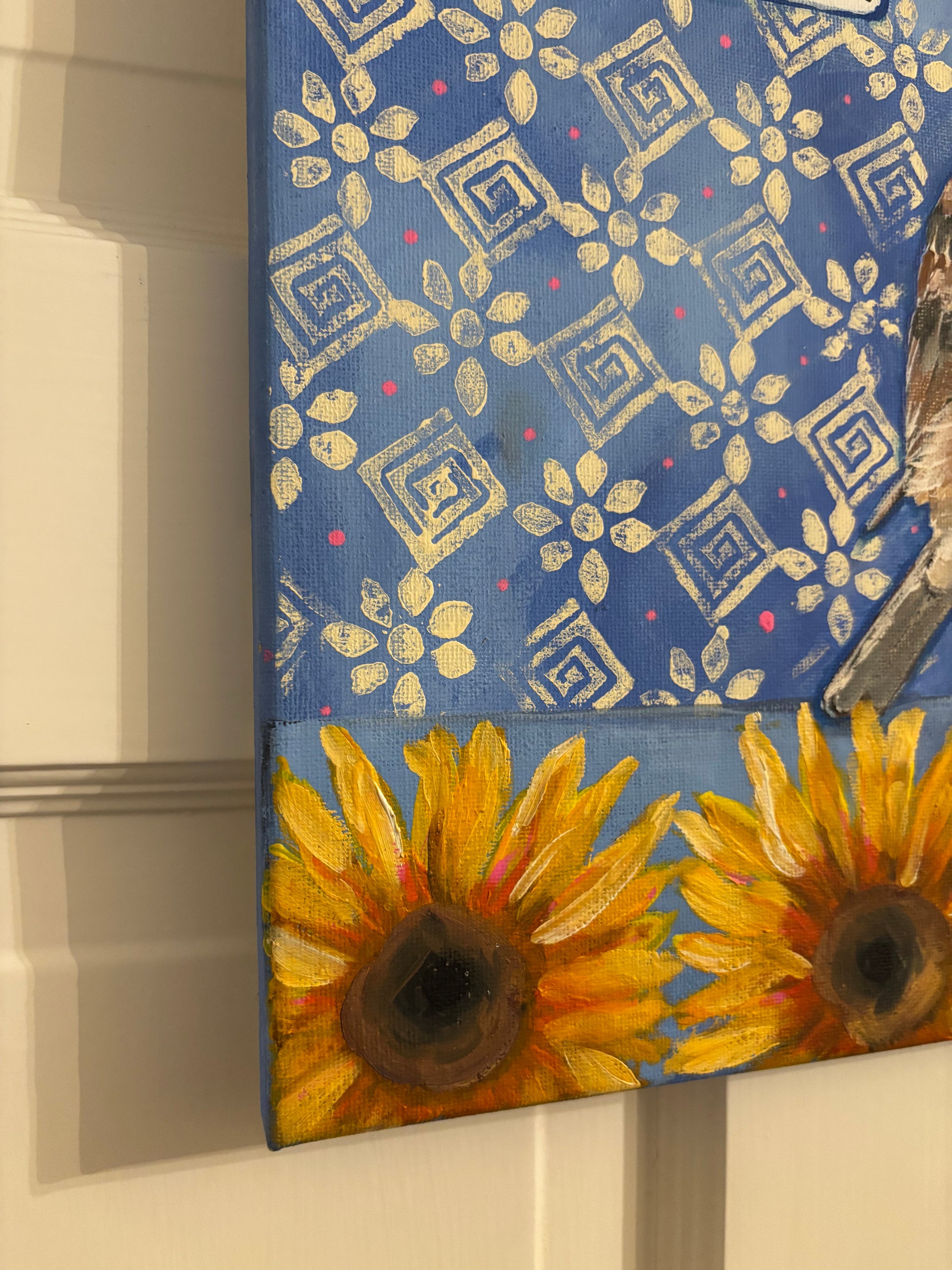 It continues to be a slog, and yet she persists. The quote from Mitch McConnell about Elizabeth Warren, “Nevertheless, she persisted,” became a rallying cry and it remains relevant today. This is a 12”x 12”x .5” acrylic painting of an American pipit with added pearl-like beads. The wall behind her is decorated with hand-carved stamps, and sunflowers in the foreground.